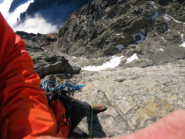 Pomaly cítim, že to nebude všetko s kostolným poriadkom. Mraky sa prevaľujú ponad hrebeň pekelnou rýchlosťou a na juhu sa pri padaní k zemi, rozplývajú. To je jasný foehn. Zostup bude teda zdĺhavý. Po dolezení cesty aj chladný. Na hrebeni to kondenzovalo, všetko je mokré a pekelne šmykľavé a pomaly z chmár začína aj popŕchať. Zlaňujem na svojom jedničkovom 60m lane a čo čert nechce, nachádzam zlaňáky dokonca v menšej ako 30m intenzite, paráda!